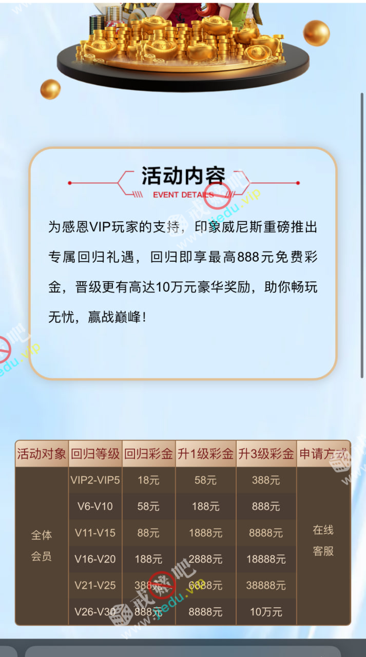 vip2起步上线直接找客服申请回访彩金,我领到了 18 块的彩金。