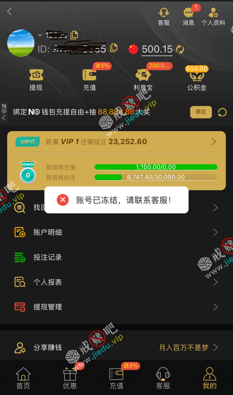 送的彩金达到 500 ,准备提款就账号被冻结了,说是我多ip套利,妈的几几嘉嘉的,草已吗,黑台。
