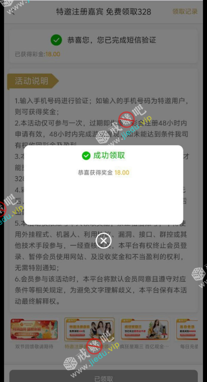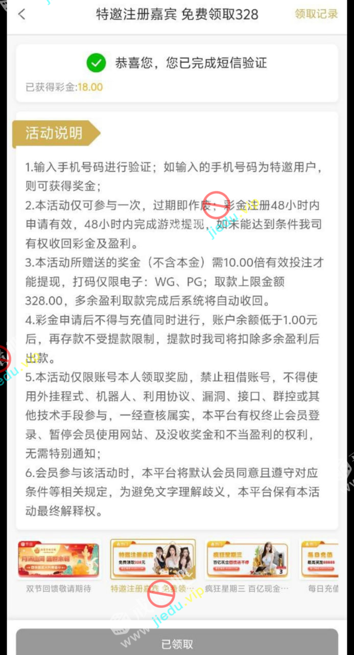 注册在活动页面,自行碰瓷短信特邀彩金,10 倍流水才可以下,领到白嫖就反馈留图赌神。