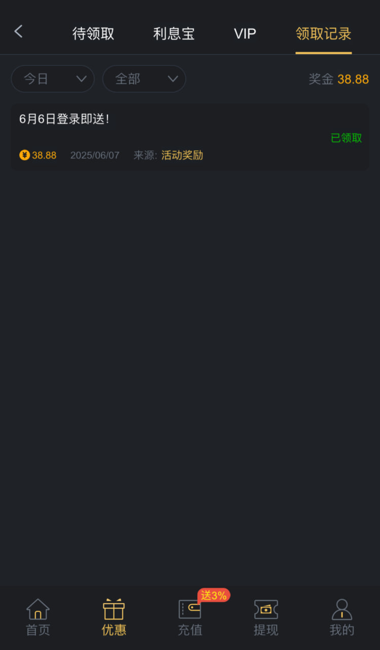 昨天有登录的今天有个彩金可以领 记得领。