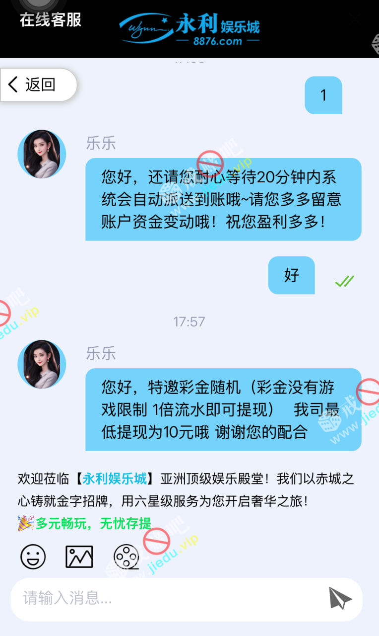 找客服说领取电话彩金 不限制游戏 一倍水最低10块钱可以提 我接到电话的 可以去碰瓷